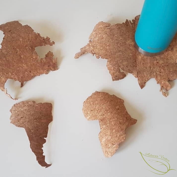 Je l’avais réalisé pour mon ado qui aime et rêve de voyages afin qu’elle puisse y punaiser des photos ou des souvenirs. Il suffit d’imprimer un planisphère, puis de le découper, ensuite vous le fixer sur une plaque de liège (j’avais du liège autocollant mais il était un peu fin, du vrai liège sera plus approprié) afin de repasser les contours, et on découpe ! Super facile, juste un peu long… Je n’avais pas fait de tuto et je ne retrouve pas de photos donc je vous propose le tuto de Le grand bazar qui est très bien et qui vous propose même le pdf à imprimer.