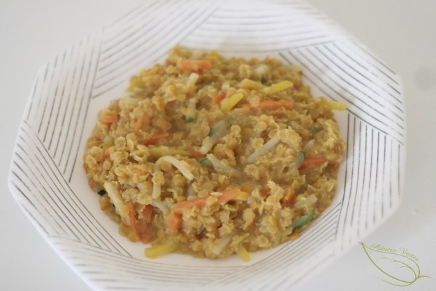 Dans une casserole, versez les lentilles corail et les carottes préalablement émincées. (Dans un soucis de rapidité, il m’arrive d’utiliser de la julienne de légumes surgelée de la marque Bio Village).