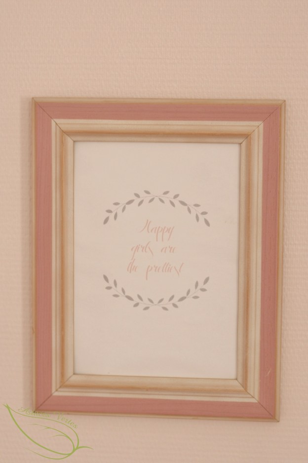 J’avais un joli cadre de couleur vieux rose qui traînait dans un placard et je trouvais dommage de ne pas l’utiliser d’autant que les murs de la chambre de la petite étaient nus de toute décoration.