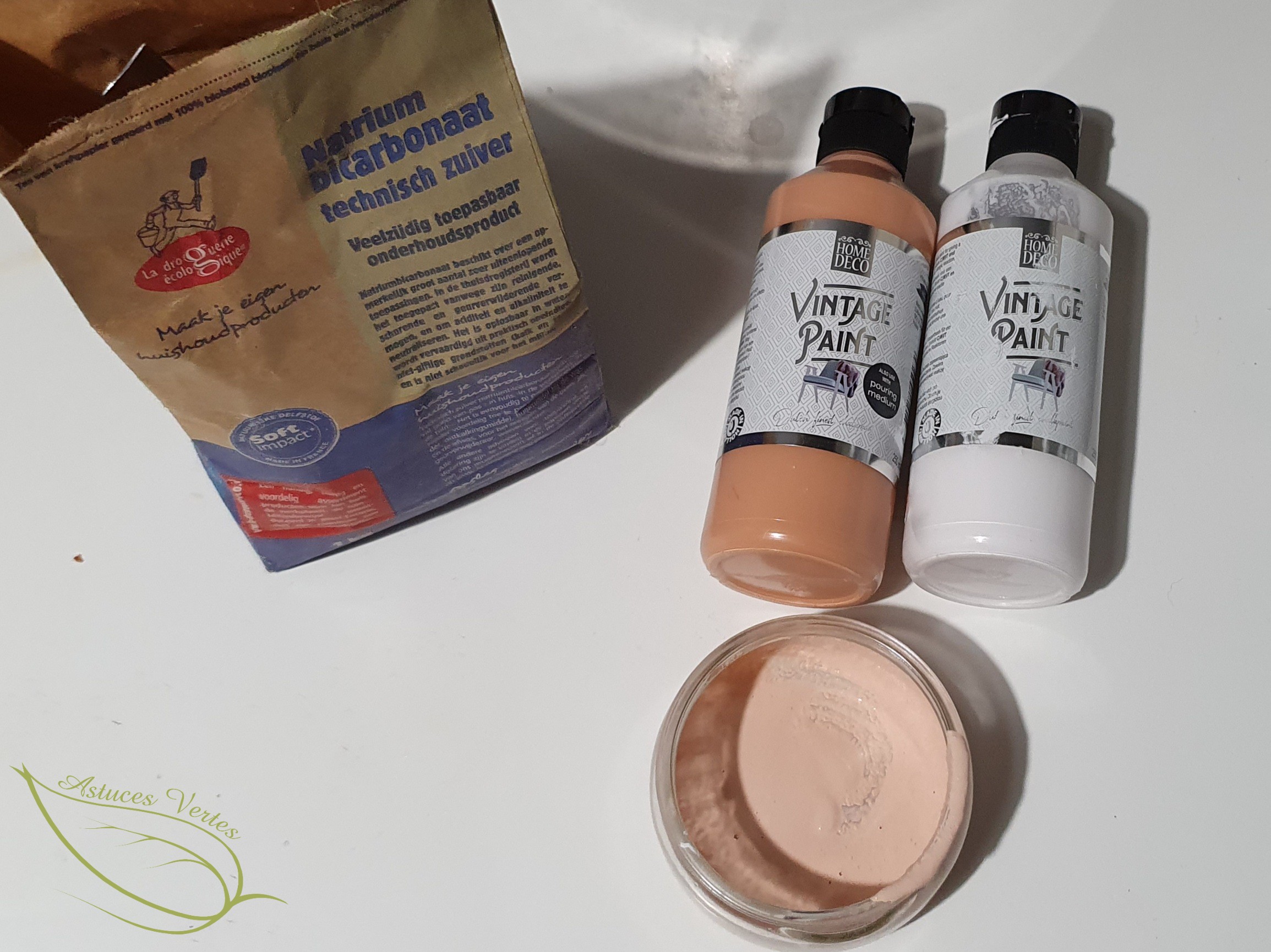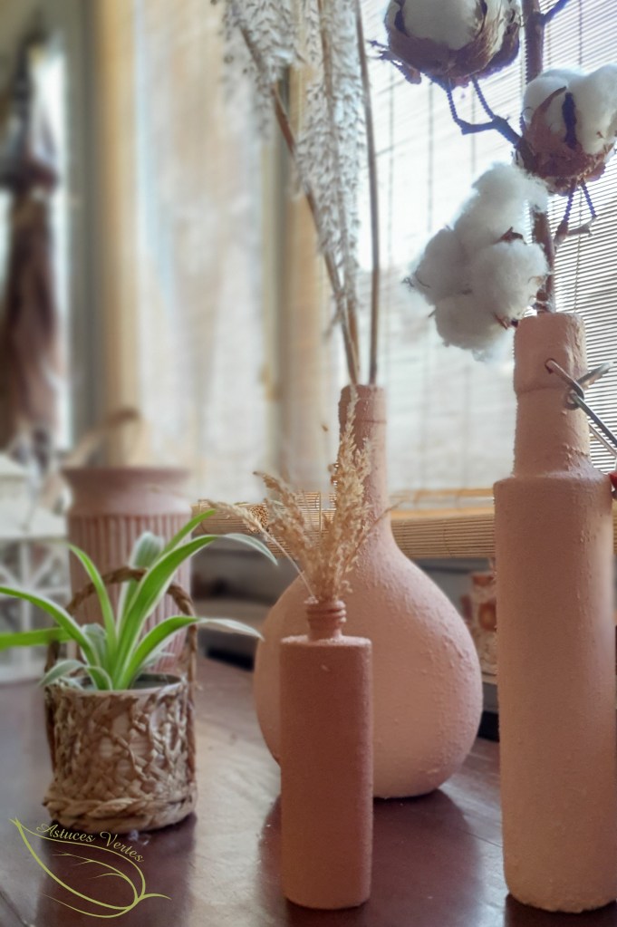 Nous l’aurez sans doute remarquer, la grande tendance du moment, c’est les fleurs séchées. Et dans quoi on les entrepose ? Dans des bouteilles recyclées en vases effet terre cuite. Pour obtenir cet effet, il y a une technique qu’on voit un peu partout dernièrement et qu’il fallait que j’essaie : ajouter du bicarbonate à la peinture pour donner cet effet irrégulier qui rappelle la terre cuite.