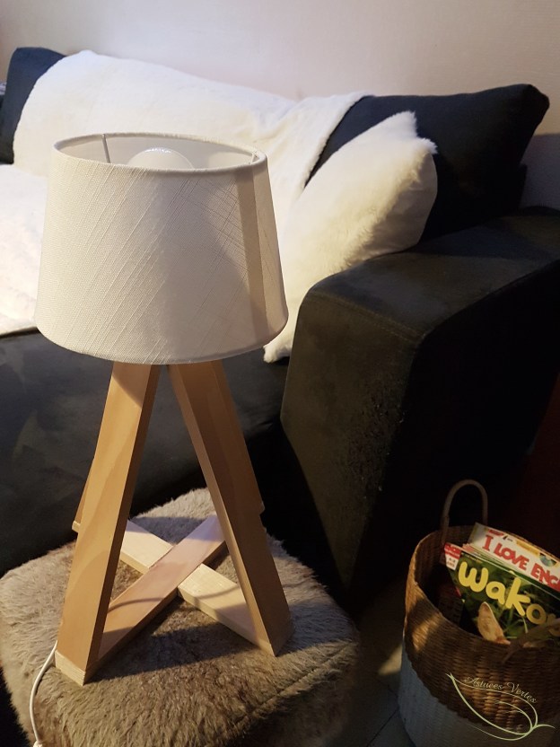 J’avais repéré une jolie lampe au style scandinave sur Maison du Monde. Et puis, j’avais ce tasseau qui me restait sur les bras… Je suis allée chez Castorama acheter un ensemble douille + fil + interrupteur (9.99 euros) ainsi qu’un raccord (2 euros et quelques). J’ai ensuite trouver un abat-jour (2.99 euros chez Action) et j’avais enfin tout le nécessaire pour m’attaquer à la fabrication de ma lampe scandinave.