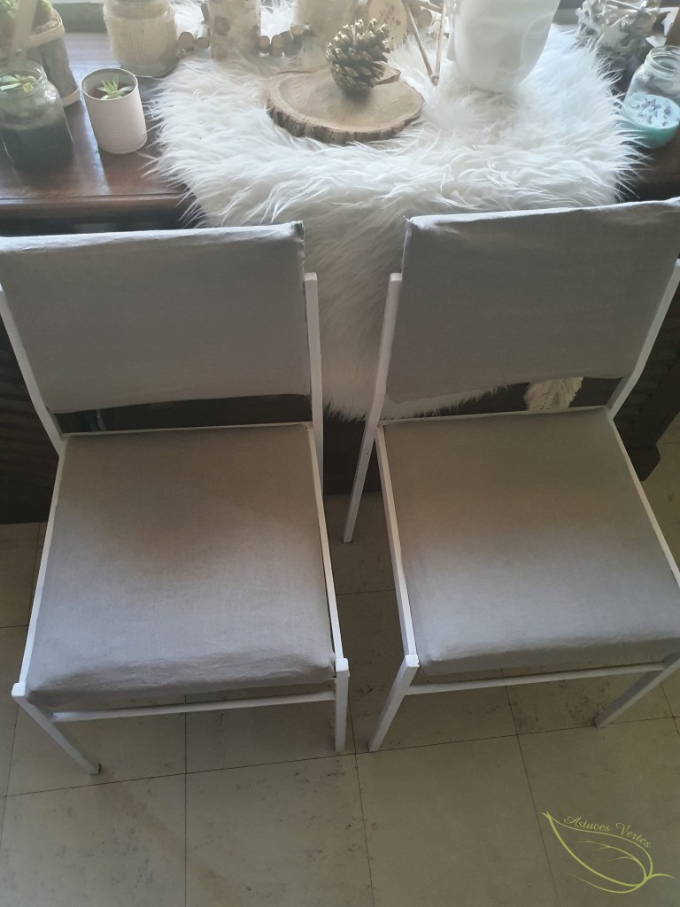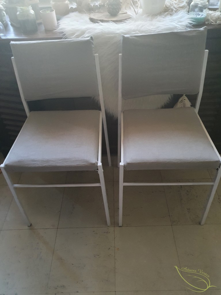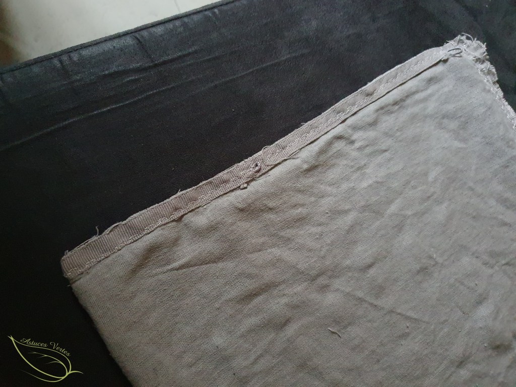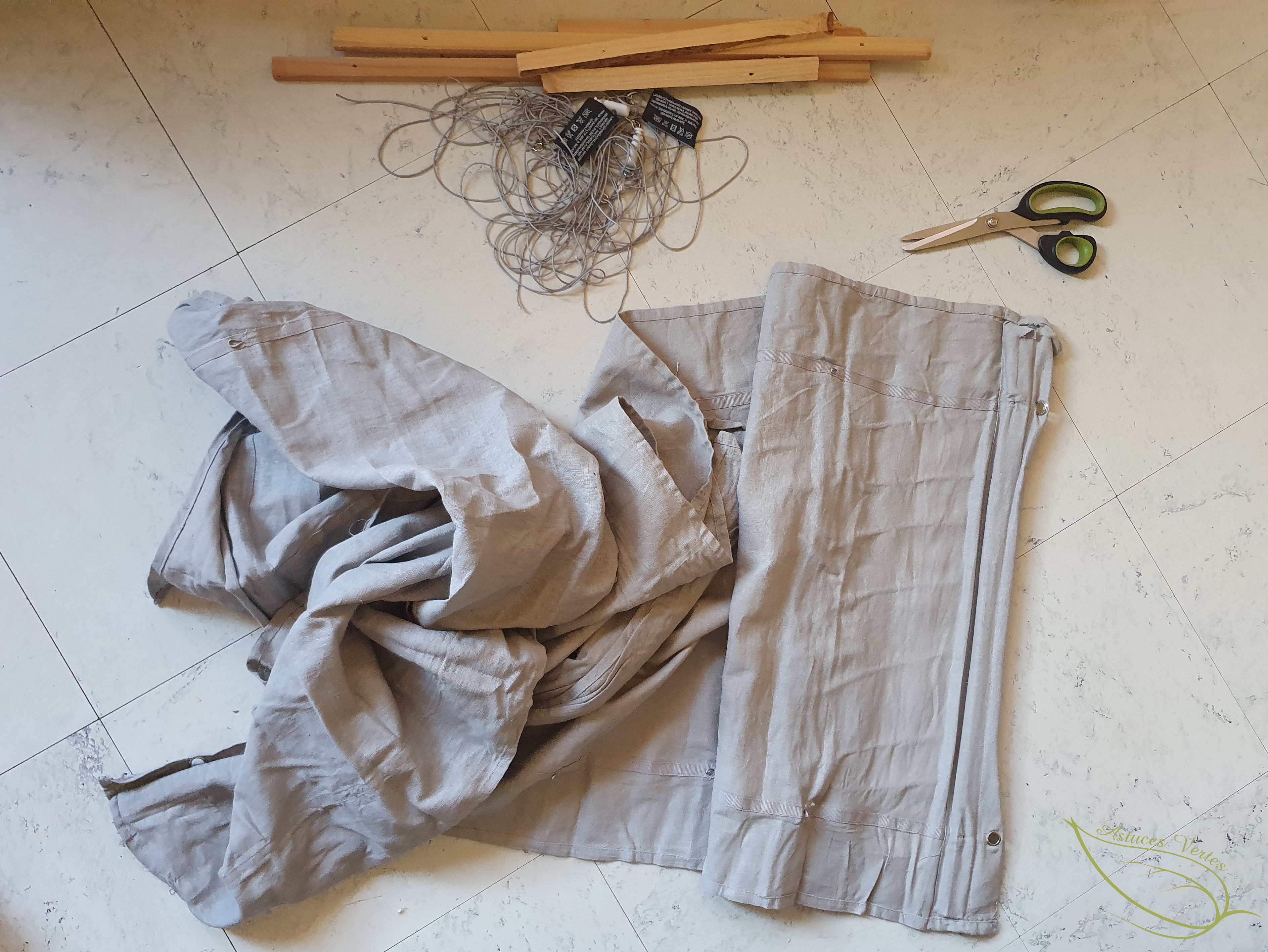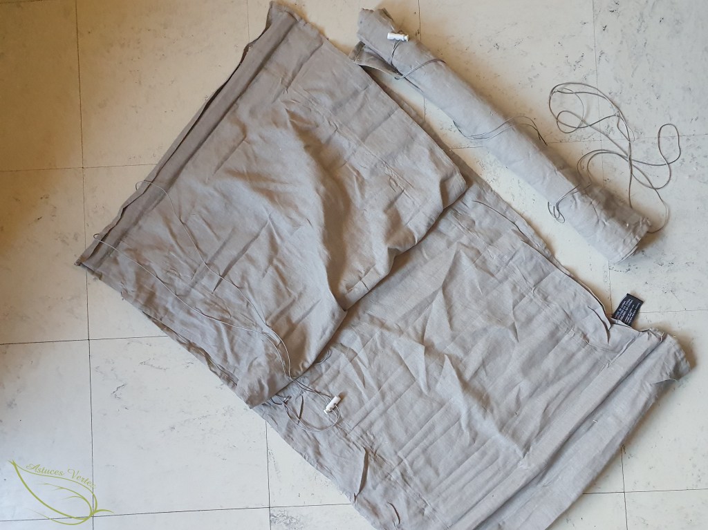 3- Pour recouvrir les assises et les dossiers, j’ai farfouillé dans ce que j’avais et j’ai décidé d’utiliser des stores en lin gris que j’avais acheté sur une brocante, mais qui ne convenaient finalement pas à la hauteur de mes fenêtres. (Quand je dis que ça peut servir…).