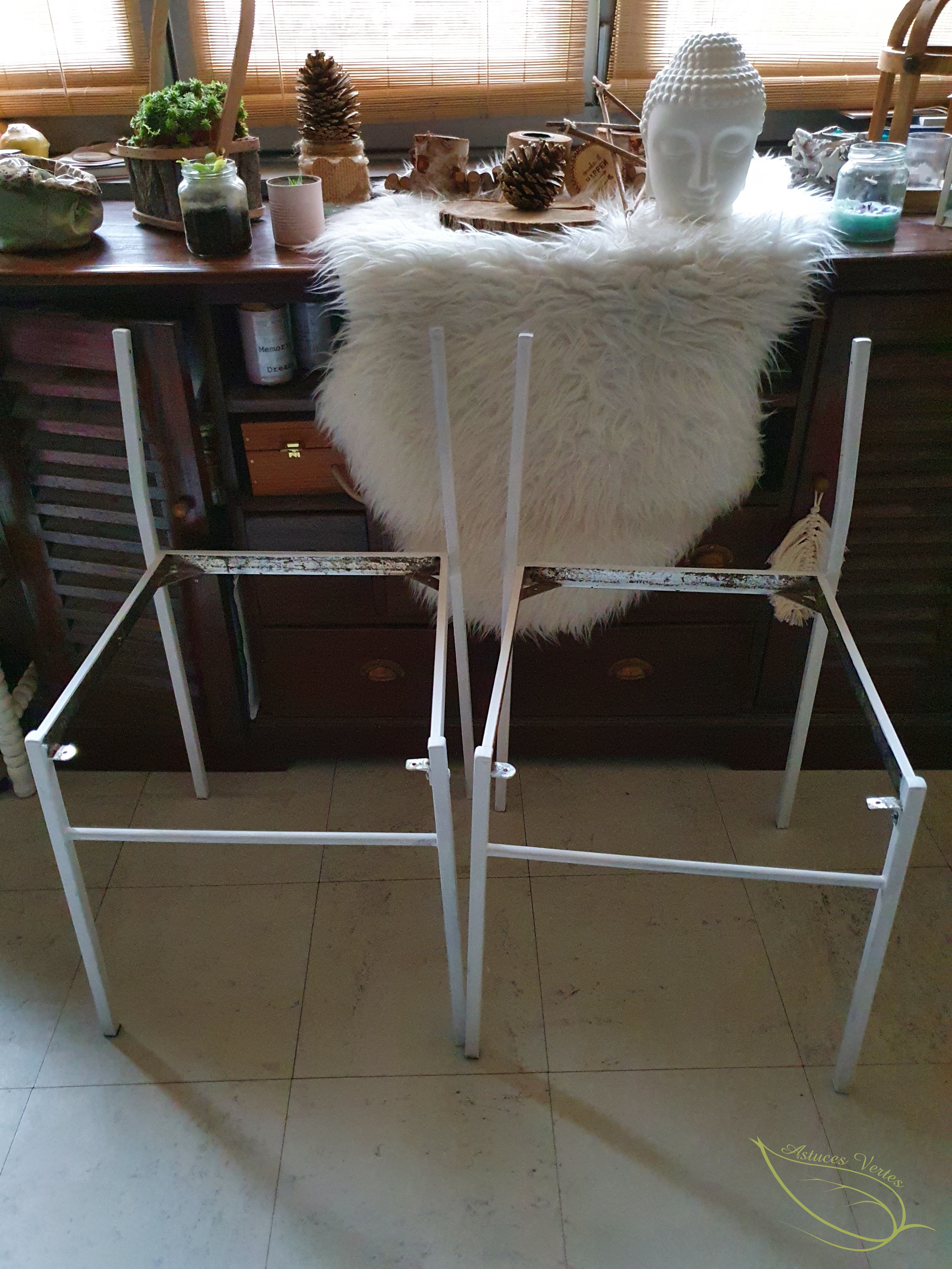 1- J’ai commencé par dévisser l’assise et le dossier. Malgré l’âge avancé de ces chaises, les vis n’étaient pas grippées et je n’ai eu aucune difficulté à les retirer. Et bien sûr, j’ai stocké les vis dans un bocal pour ne pas les perdre.