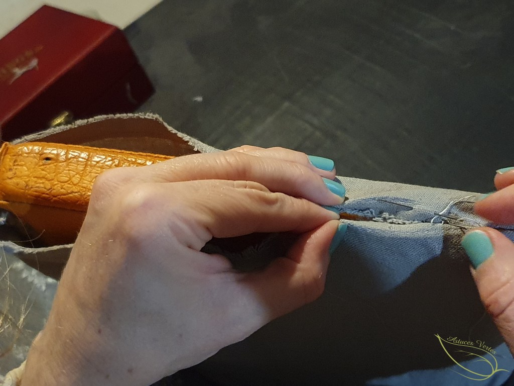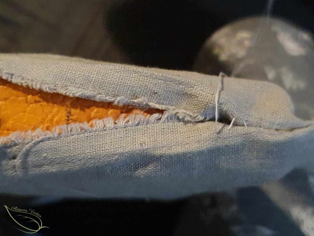 - Pour les dossiers, j’avais prévu de coudre des housses à la machine à coudre, il a donc fallu prévoir les dimensions nécessaires : (Longueur (+2cm) + largeur (+2cm) ) X2 pour chaque dossier. Vous me suivez ? Ensuite j’ai cousu face contre face sur 3 côtés en laissant le quatrième ouvert pour pouvoir y glisser le dossier. A ce sujet, je n’ai pas retiré le vinyle qui recouvrait les chaises car je craignais que ce soit un peu dur. Ensuite, j’ai refermé le quatrième côté avec une couture invisible à la main. Important : Pensez à faire des marques au stylo sur le tissu à l’endroit où se trouve les trous pour les vis, ou carrément à percer le tissu, sinon je ne vous raconte pas la galère…