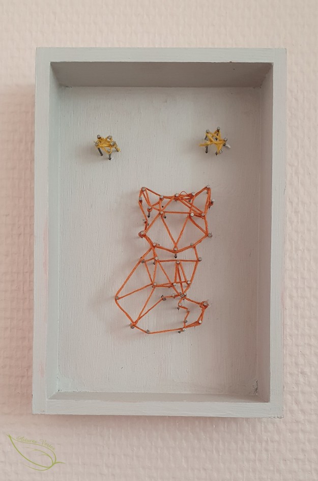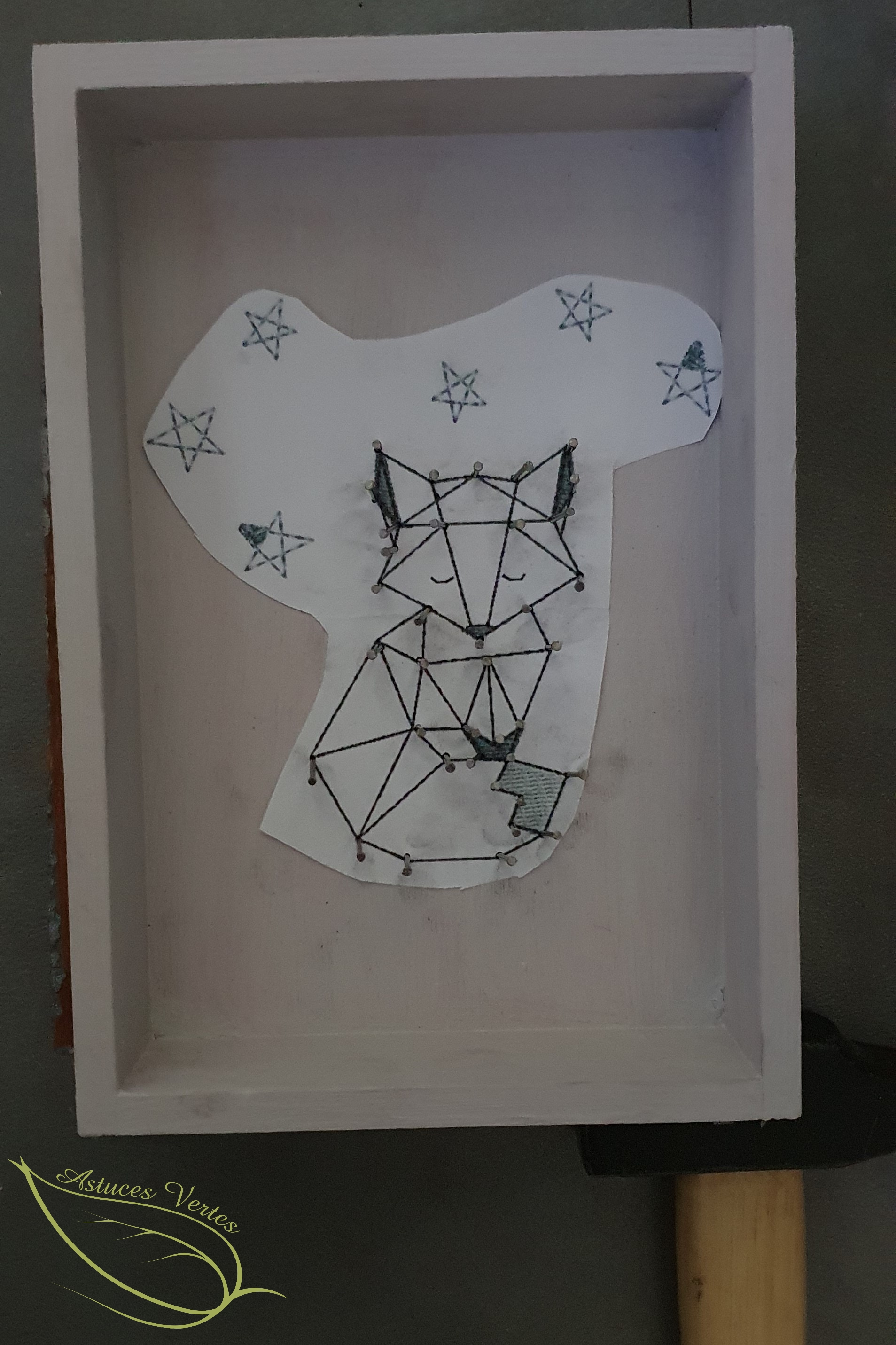 Etape 1 : Choisissez une image assez simple, voire géométrique. J’ai trouvé une image de renard stylisé sur pinterest que j’ai ensuite imprimé au format de ma boîte (préalablement peinte).