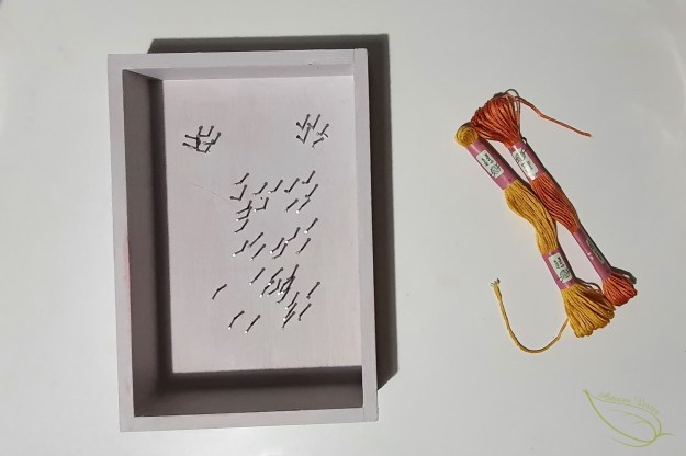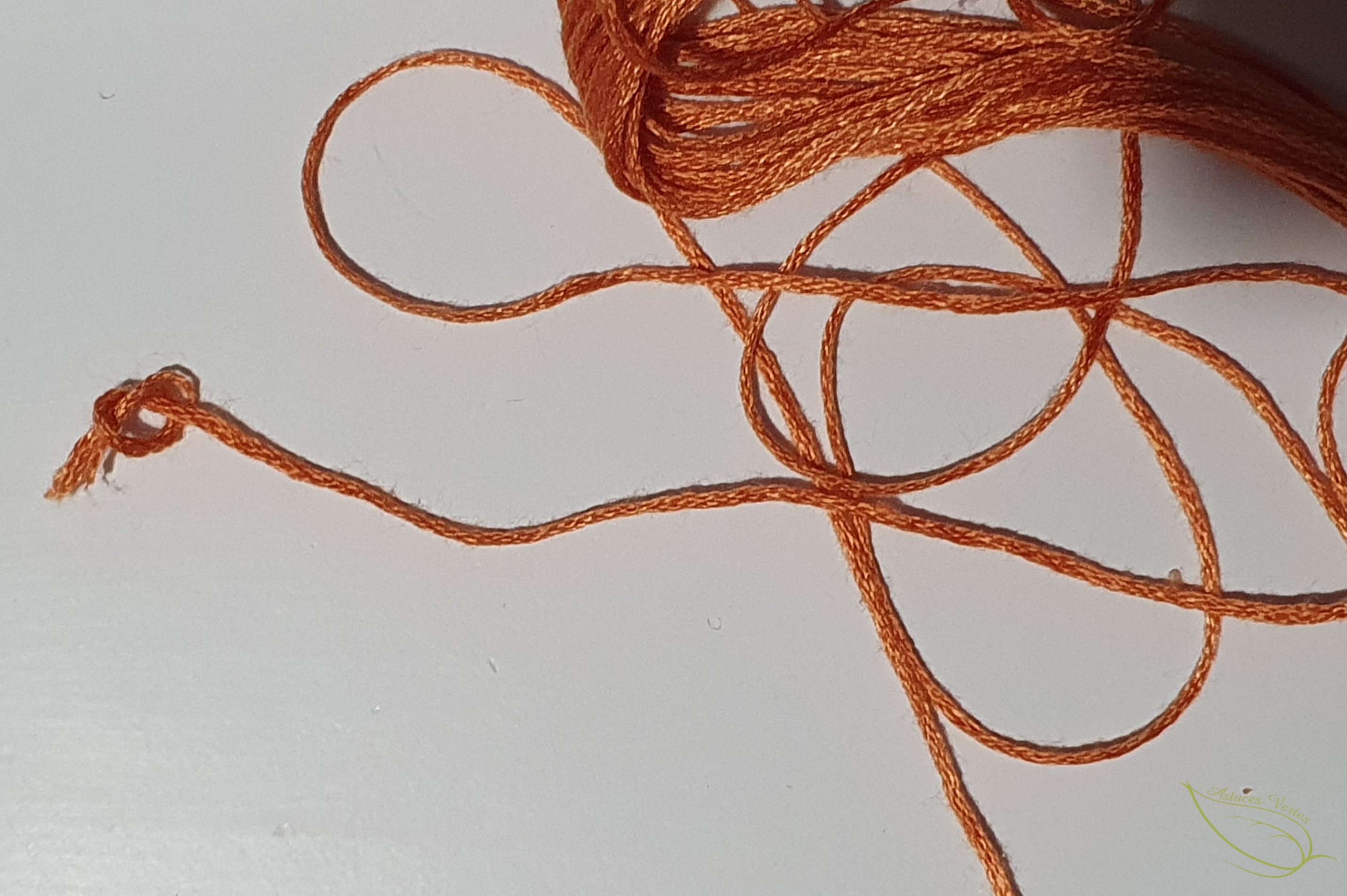 Etape 4 : Faites un nœud au bout de votre fil. Là j’ai opté pour un fil de coton orange (de ceux qu’on utilise pour les bracelets brésiliens).