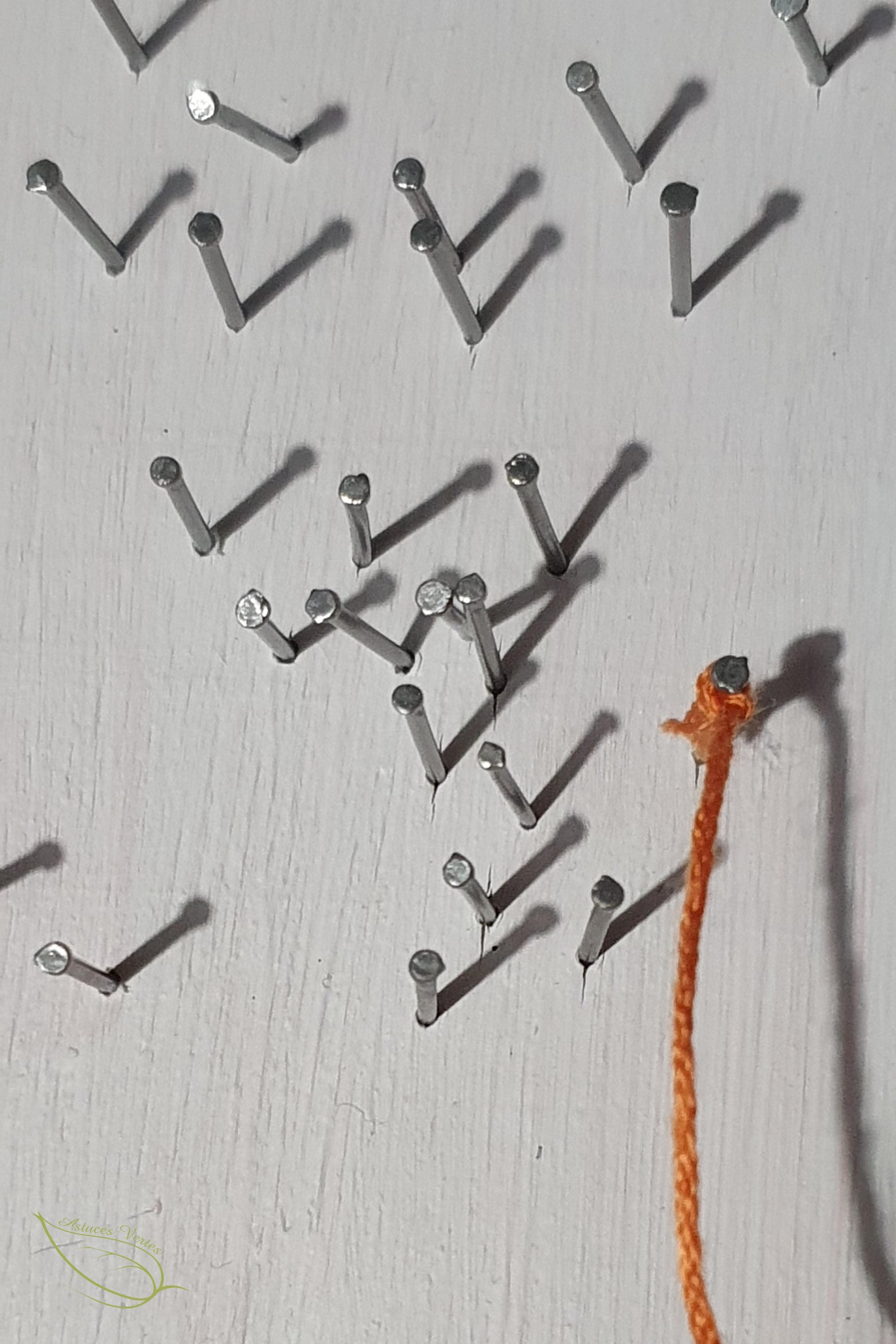 Attention à ne pas les planter trop profondément pour ne pas perforer la planche ! Pensez également que la tête va permettre de tenir le fil par la suite donc elle doit bien ressortir et en même temps le clou doit être suffisamment enfoncé pour ne pas bouger par la suite. Bref, c’est une question de doigté, ça va venir 😉