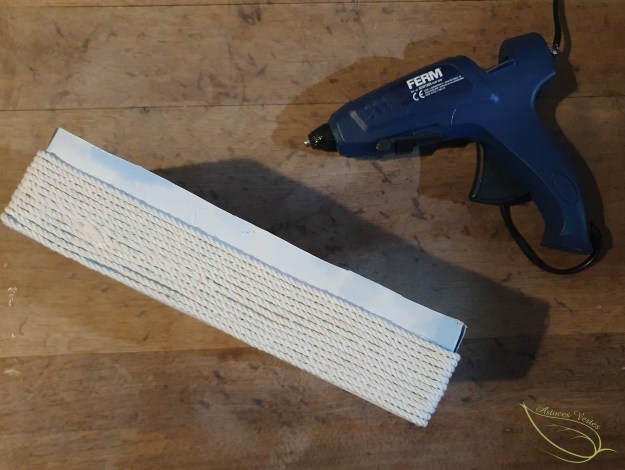 5- Très rapidement, et en prenant bien soin de ne pas vous brûler avec la colle (croyez moi ça fait mal ), déroulez votre corde sur le filet de colle et appuyez légèrement pour bien tenir l’ensemble.