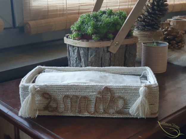 Et puis, il y a quelques jours, j’ai eu le déclic en voyant la boite à mouchoirs vide qui trônait dans le salon. J’ai utilisé des restes de corde blanche de 2mm de diamètre que j’avais acheté l’an dernier sur Amazon (oui je sais, c’est pas bien !) et en fait cette corde ne se prêtait pas du tout au macramé si bien que j’avais du en racheter. La réalisation est on ne peut plus simple. Elle prend juste un peu de temps. Personnellement, je l’ai fait en regardant un film de Noël (j’assume ! ).