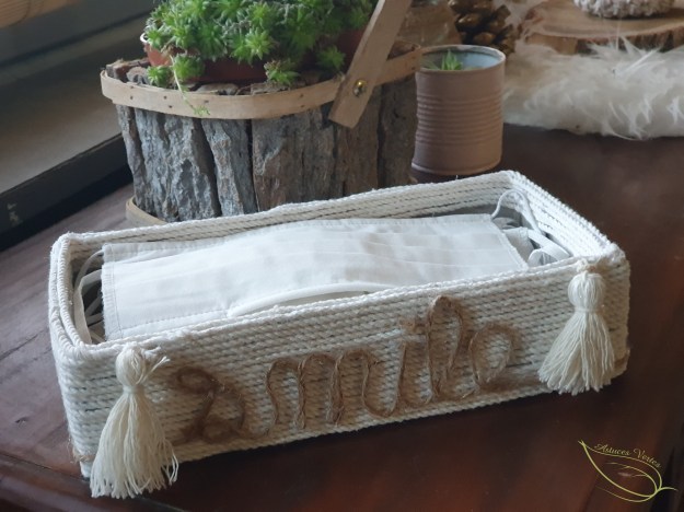 Très vite, je me suis retrouvée avec plein de masques lavables et aucun endroit pour les ranger. Je voulais créer un petit panier que je pourrais disposer à l’entrée afin que les masques soient visibles et accessibles (pour éviter d’oublier) en partant.