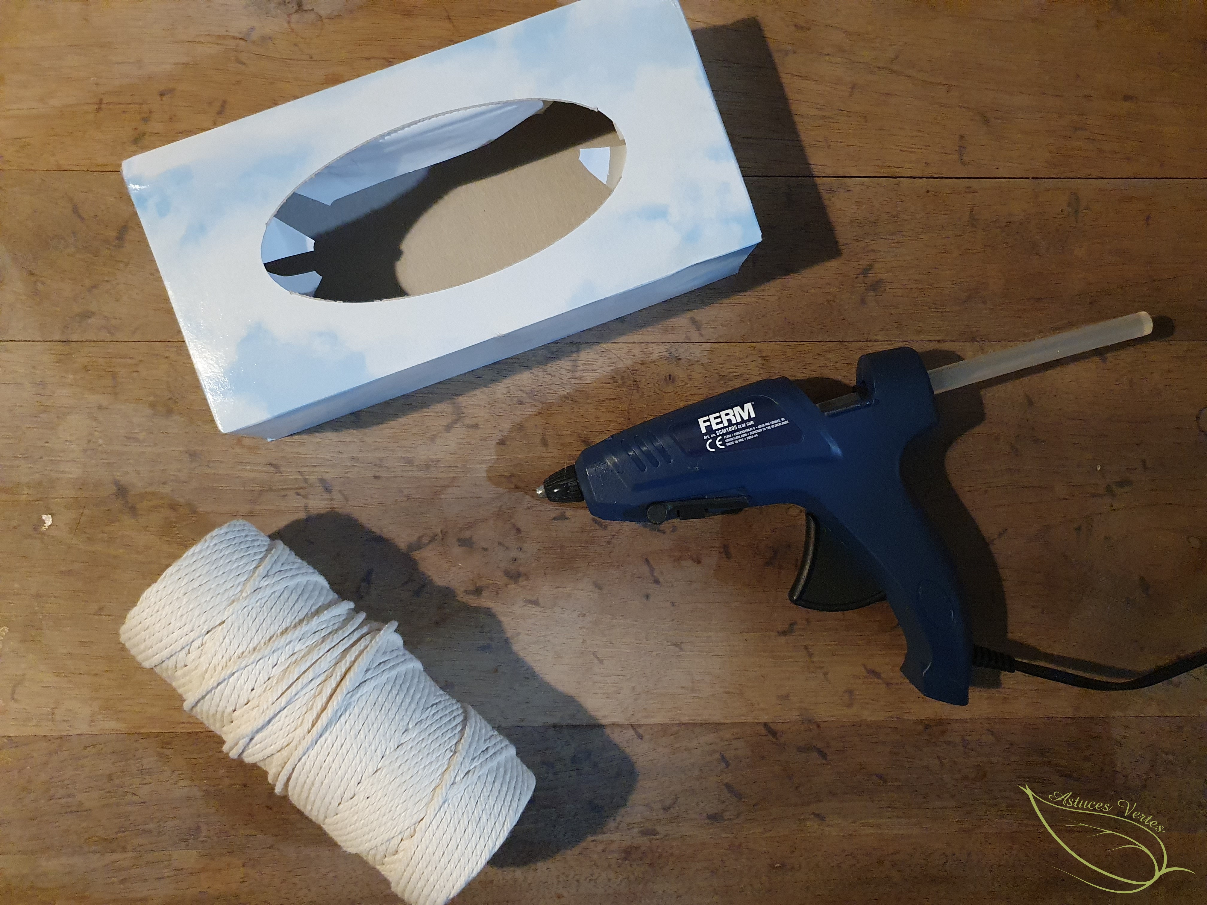 Et puis, il y a quelques jours, j’ai eu le déclic en voyant la boite à mouchoirs vide qui trônait dans le salon. J’ai utilisé des restes de corde blanche de 2mm de diamètre que j’avais acheté l’an dernier sur Amazon (oui je sais, c’est pas bien !) et en fait cette corde ne se prêtait pas du tout au macramé si bien que j’avais du en racheter. La réalisation est on ne peut plus simple. Elle prend juste un peu de temps. Personnellement, je l’ai fait en regardant un film de Noël (j’assume ! ).