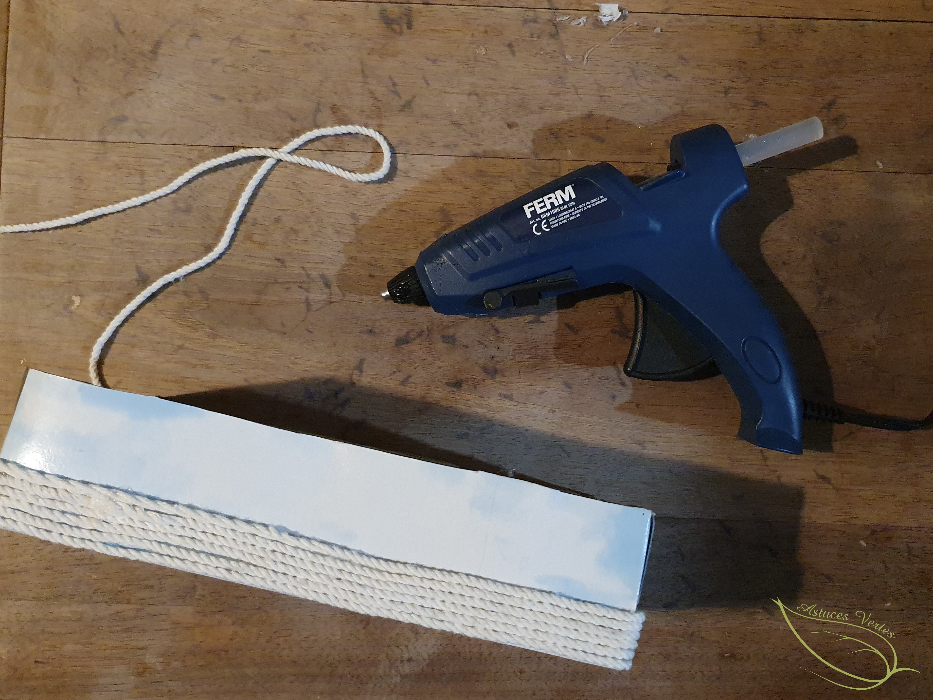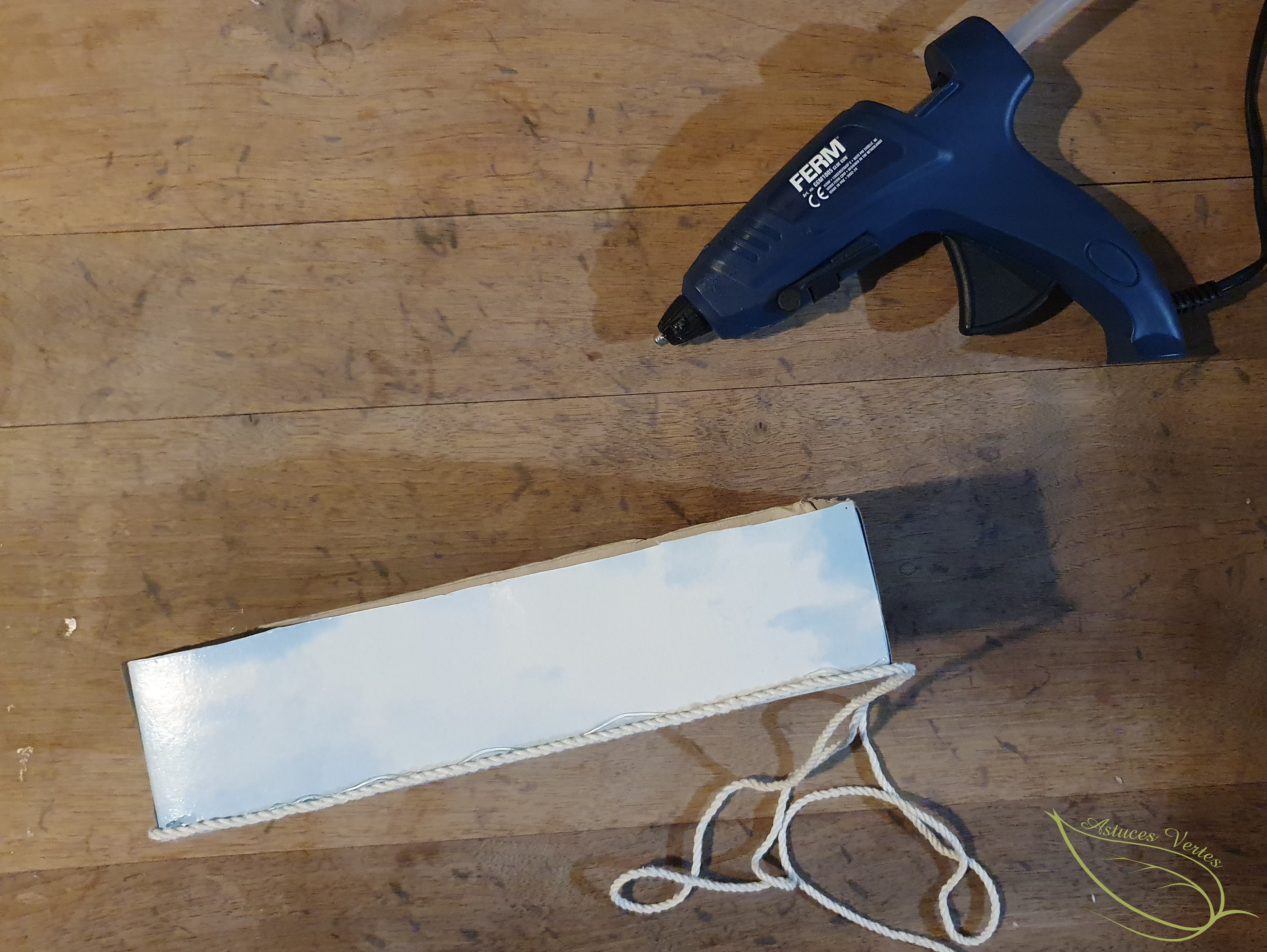 2- Branchez le pistolet à colle et déroulez un peu votre bobine de corde. Puis, à l’aide du pistolet à colle, déposez une pointe de colle chaude sur le coin gauche de la boîte, puis posez la pointe de votre corde.