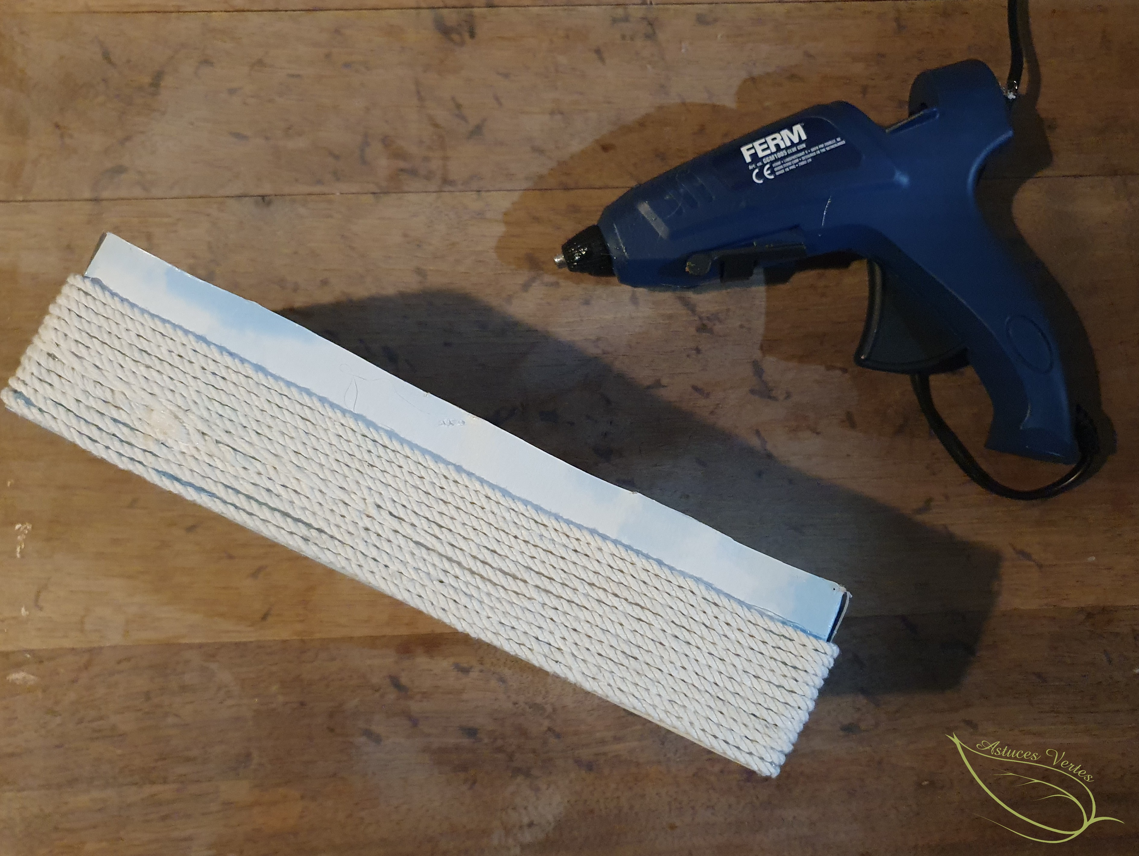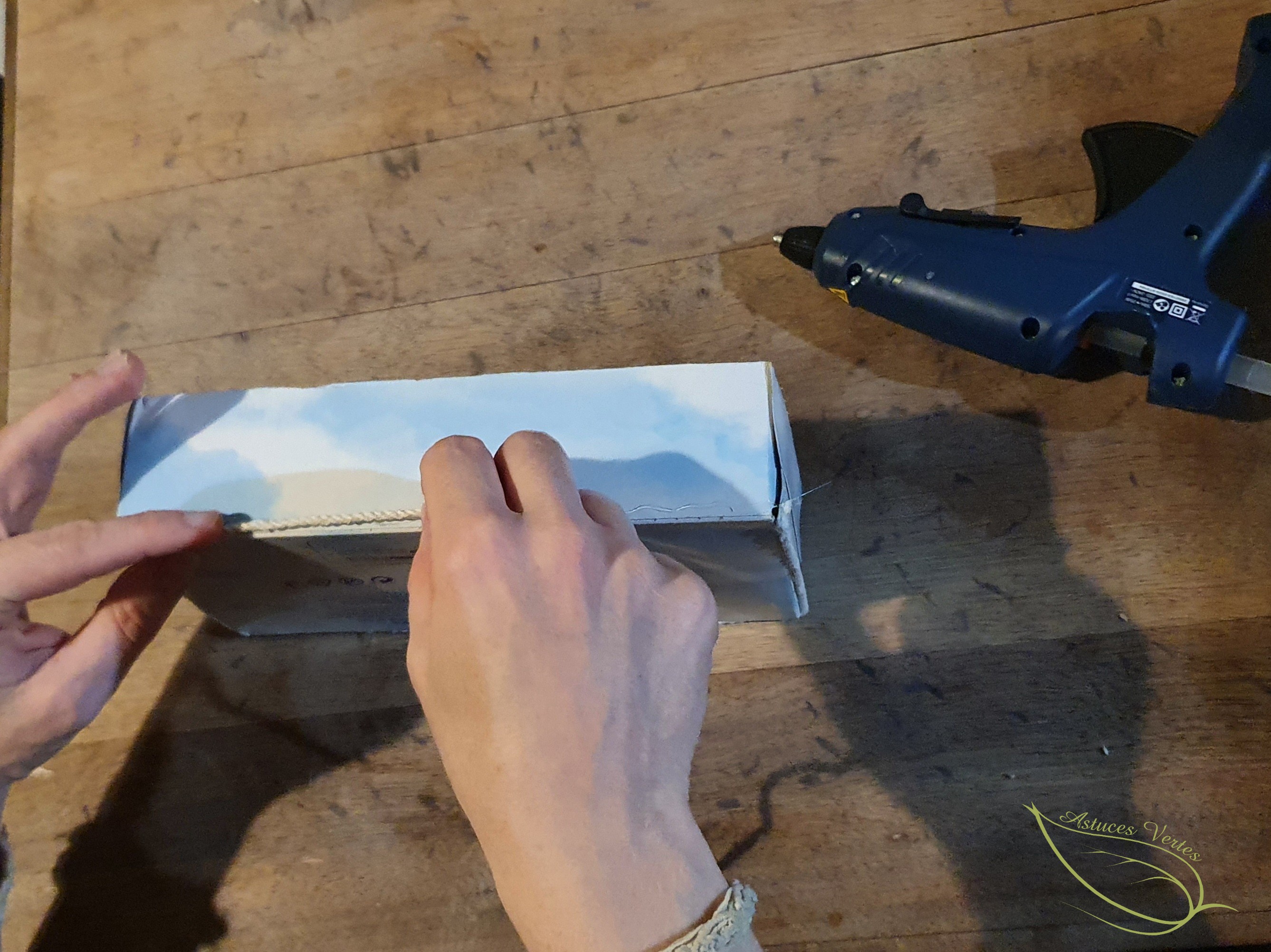 6- Répétez l’opération sur la longueur de la face suivante et ainsi de suite jusqu’en haut : On va simplement enrouler la corde autour de la boite en la maintenant avec de la colle chaude à chaque fois afin de recouvrir toute la surface de la boîte en carton.