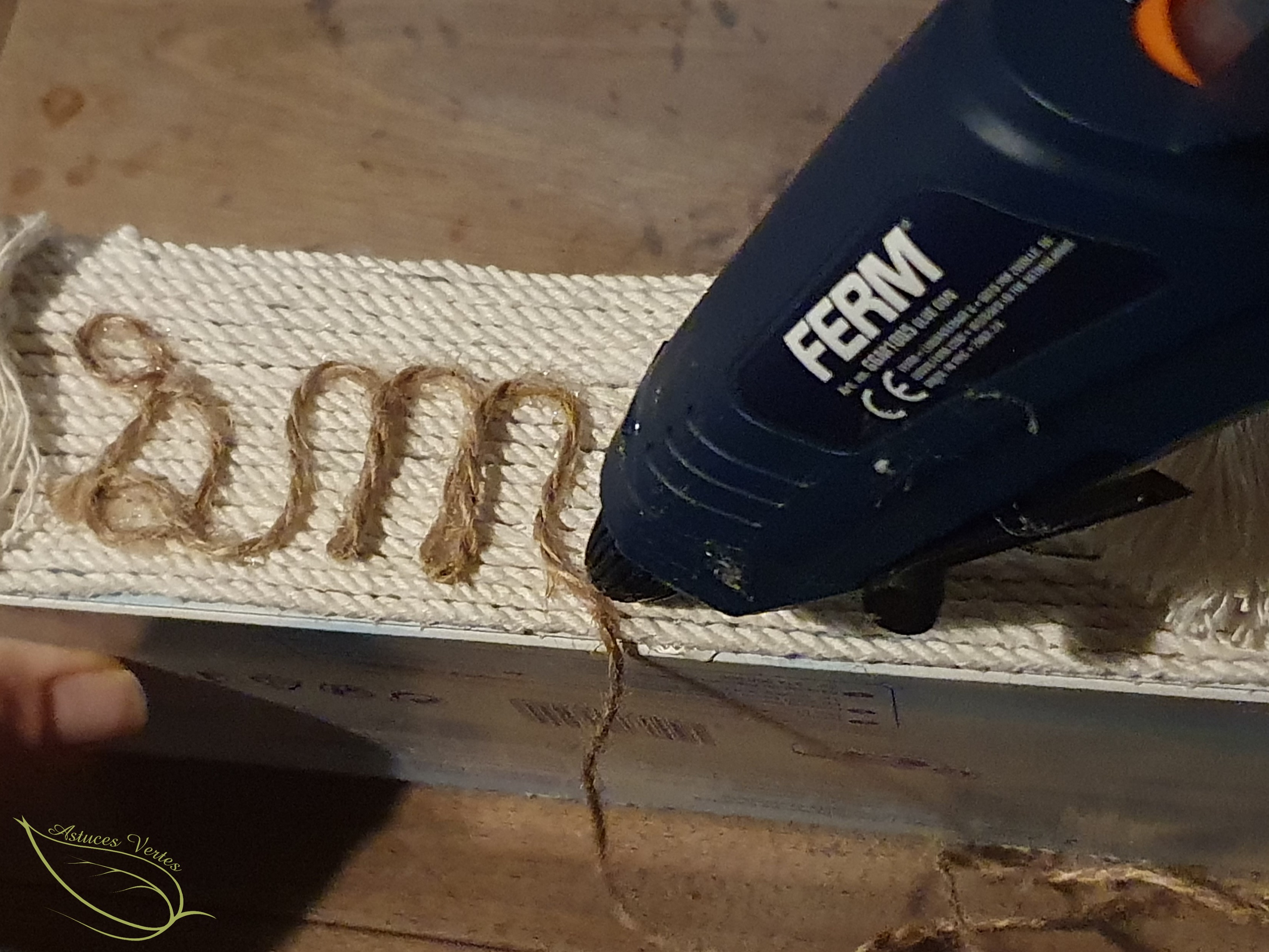 11- Déposez une pointe de colle chaude à la base de votre première lettre et disposez la pointe de votre ficelle. Puis formez la première lettre avec l’aide de votre pistolet à colle et collez immédiatement la ficelle. Parfois j’ai formé la lettre en un coup, parfois en deux ou trois fois.