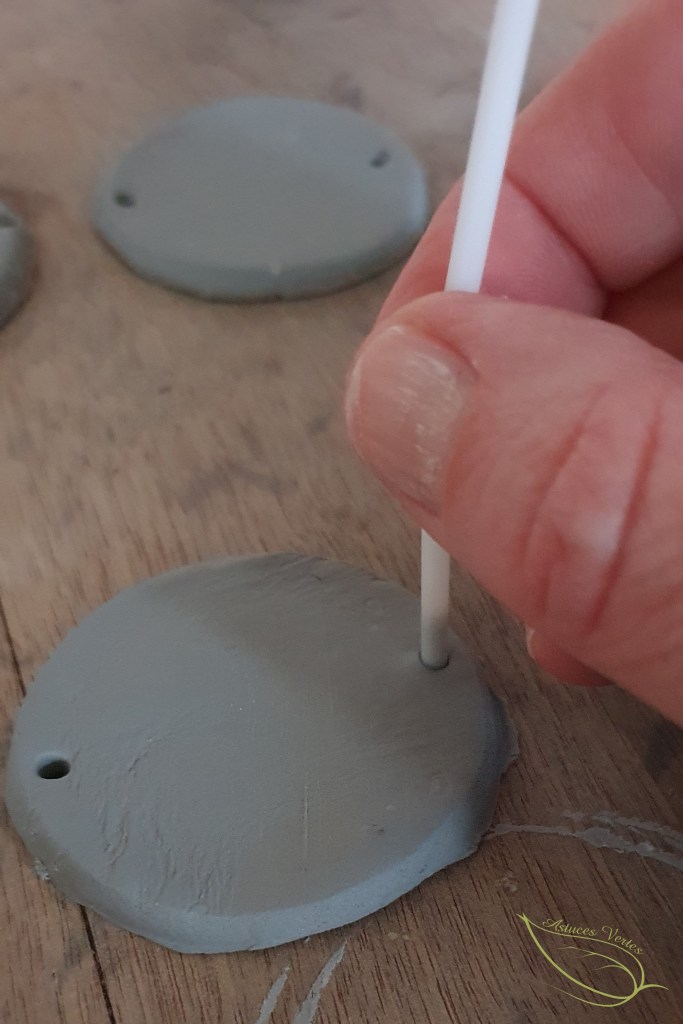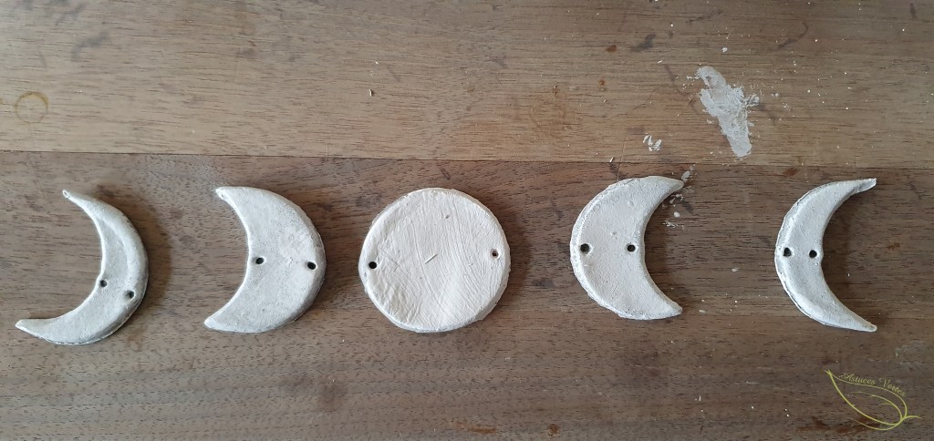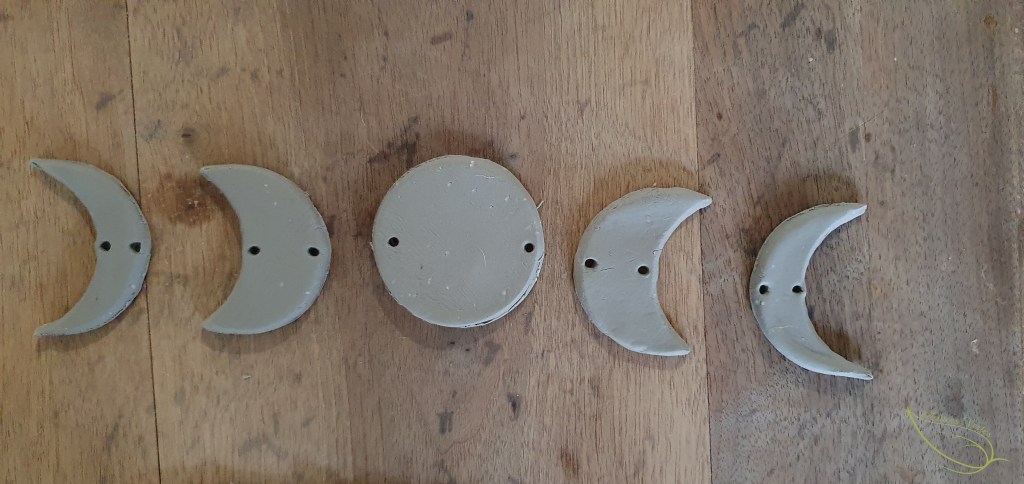 9- Une fois les lunes bien sèches, on va pouvoir les suspendre. La plupart des suspensions que j’avais repérées se présentaient à la verticale. Mais j’avais dans l’idée de faire une sorte de guirlande (d’où le positionnement des trous).