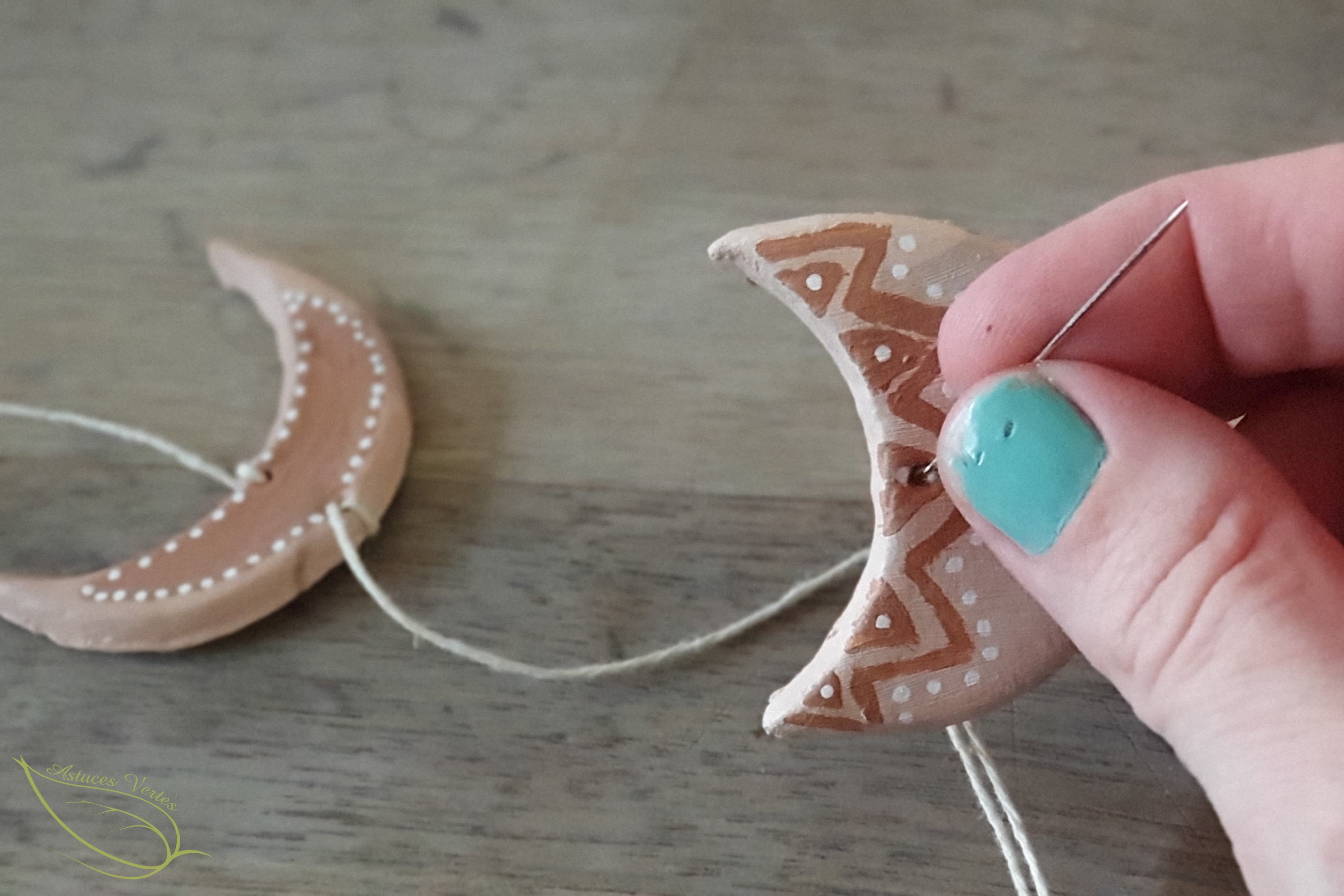 Passez la ficelle dans une grosse aiguille et en partant de la gauche, passez votre aiguille dans le trou de gauche du premier croissant de lune par l’arrière, puis dans le second trou également par l’arrière afin que le fil ne soit pas visible devant.