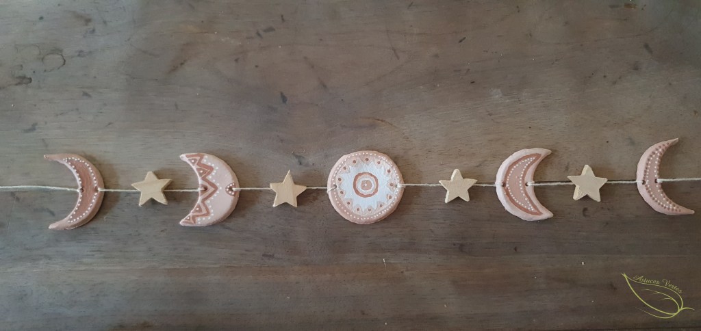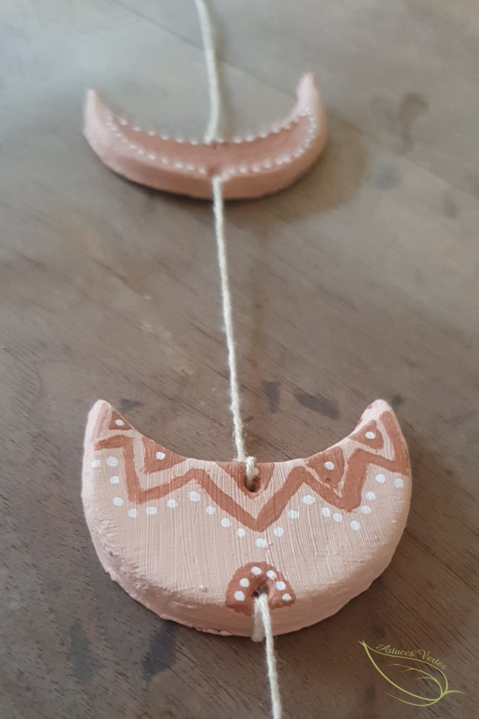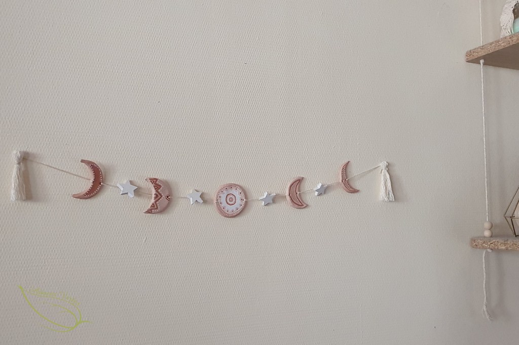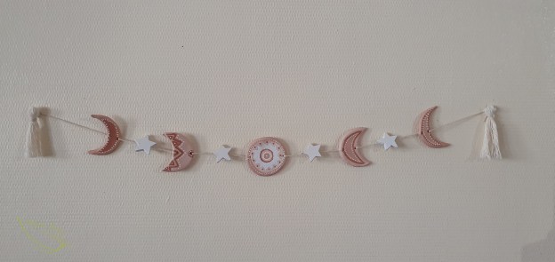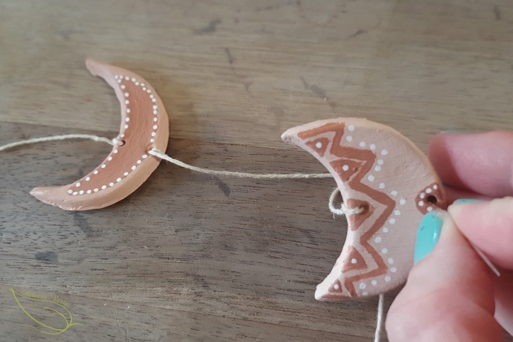 10- Une fois que vous avez passer la ficelle dans toutes les parties, vous avez pratiquement terminé. Je trouvais que ça manquait de quelque chose et j’ai pensé à ajouter des perles en bois entre chaque lune, puis j’ai retrouvé un paquet de petits étoiles en bois.