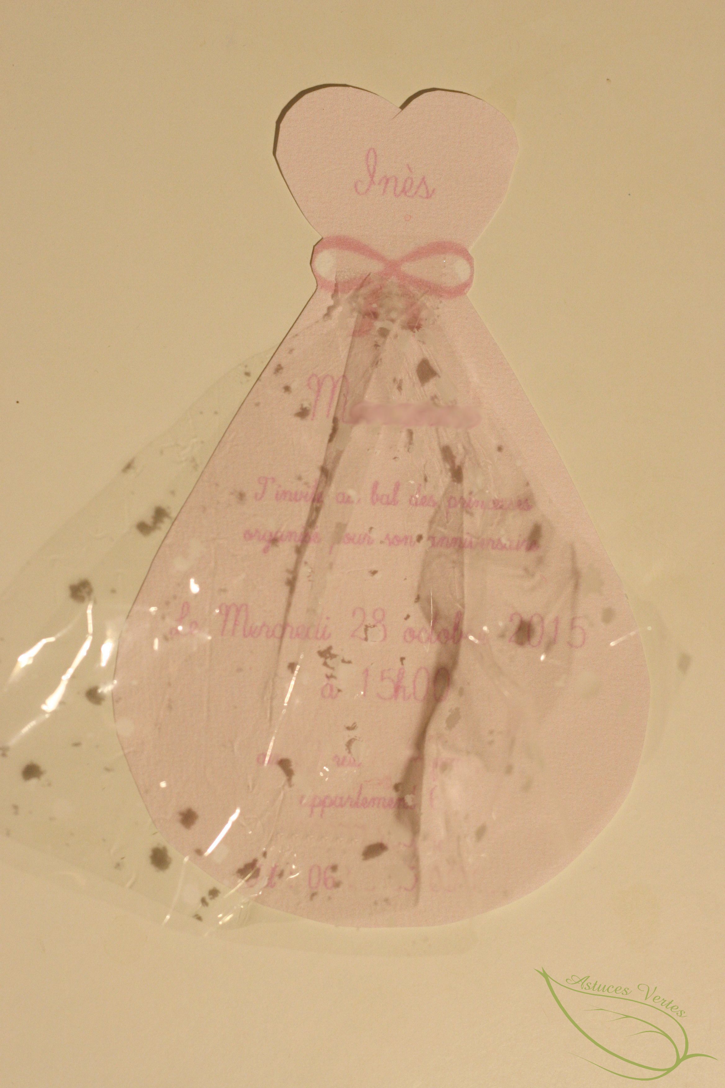 Pour réaliser les cartons d’invitation, je suis partie d’un gabarit téléchargé gratuitement sur internet que j’ai ensuite personnalisé avec l’aide de photofiltre et d’un peu de papier glacé récup’ (merci maîtresse d’emballer si joliment les cadeaux de fête des mères ^^ ). Et voilà une jolie invitation totalement récup’ en forme de robe de princesse qui donne le ton 🙂