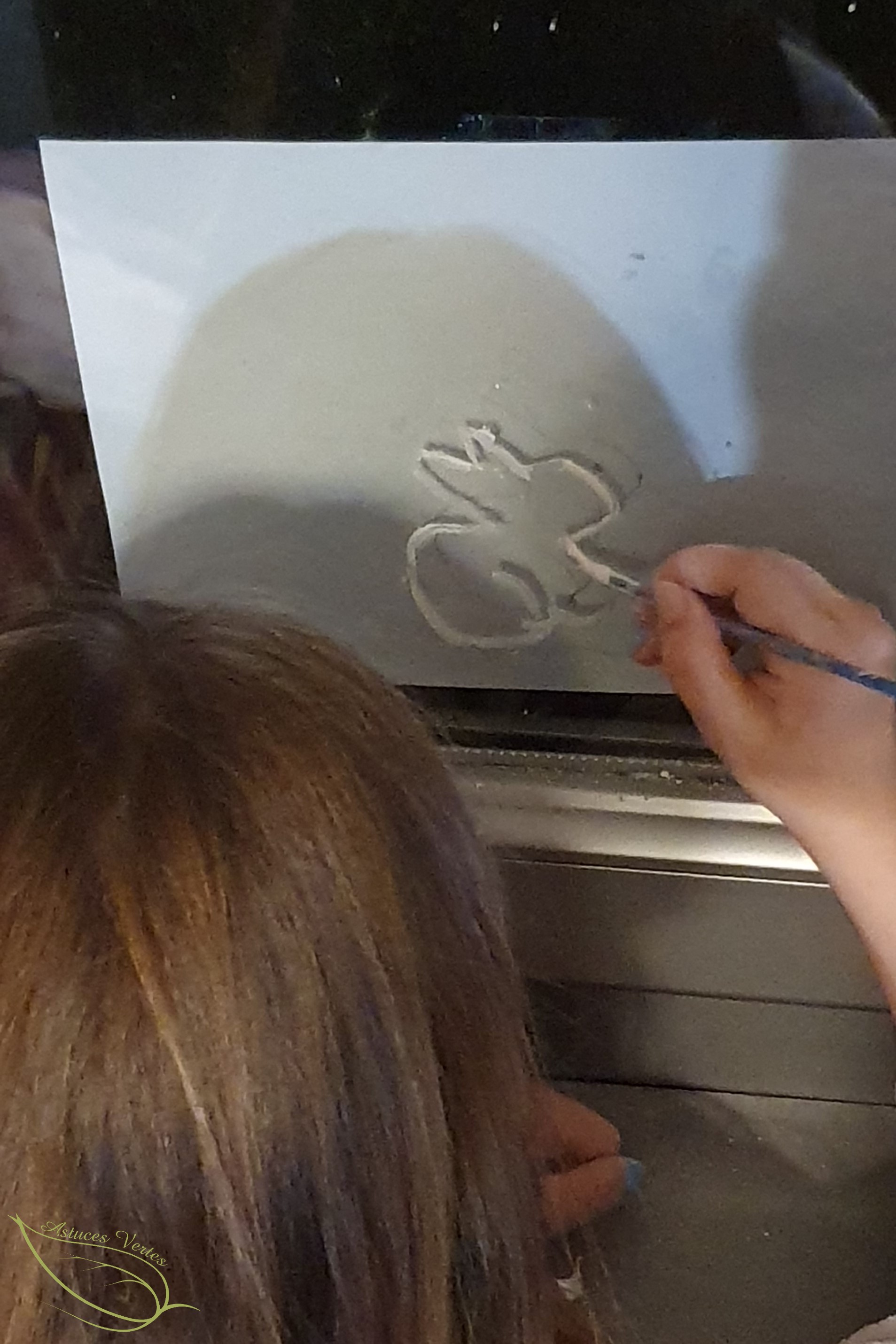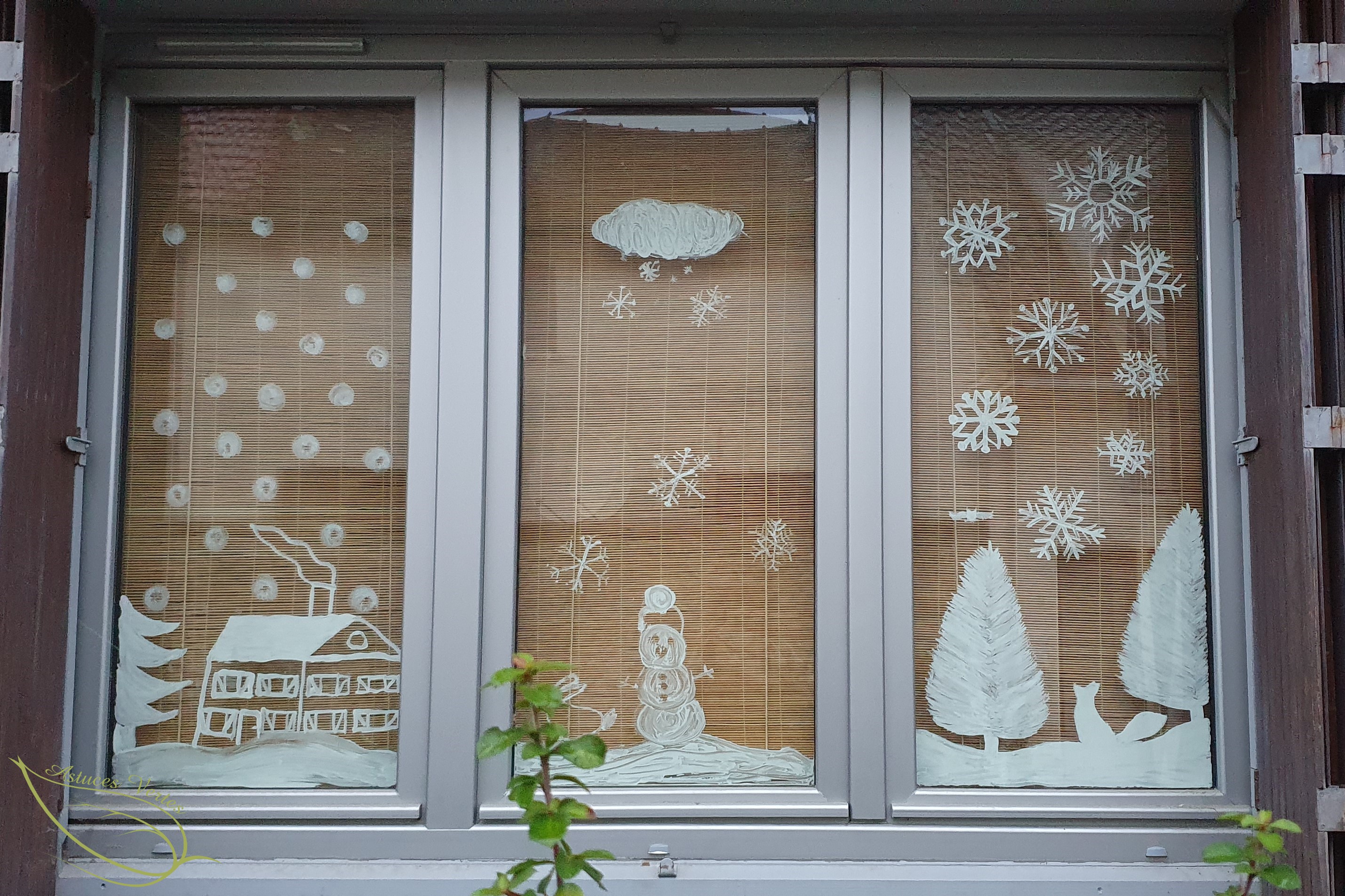 Vous pouvez utiliser un pochoir ou encore un modèle que vous scotcherez sur la vitre à l’extérieur. Vous n’aurez plus qu’à repasser les contours sur la fenêtre intérieure avec la peinture à la façon d’un calque.