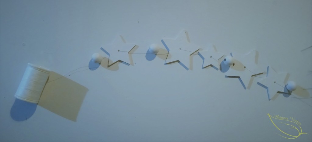 3- Enfilez vos motifs en bois et vos perles sur un fil à coudre sans le couper ! J’ai opté pour du fil blanc mais du fil beige aurait tout aussi bien convenu. Au final, on ne le voit pas du tout.