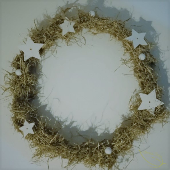 4- Fixez l’extrémité de votre fil sur un morceau de ficelle à l’aide d’un double nœud. Ensuite, en tenant votre support d’une main et votre bobine de fil dans l’autre, vous allez enrouler votre fil à coudre tout autour de votre couronne pour bien fixer les brins de foin. J’ai fait deux tours. Mes petits motifs en bois se baladant sur le fil, j’ai pu les disposer à ma guise à l’endroit que je souhaitais. Il est aussi possible de fixer le fil seul puis de venir coller les sujets au pistolet à colle, notamment si vous avez utilisé de la pate auto-durcissante ou des éléments naturels.