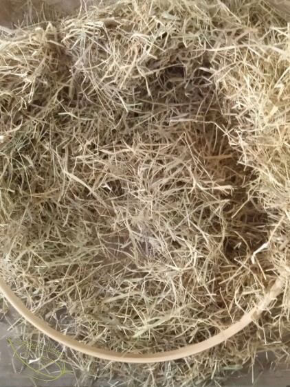 J’avais utilisé un paquet de foin que notre lapin n’aime pas, mais contrairement à d’autres marques, il se présente sous une forme que je qualifierais d’hachée, les brins étant vraiment très courts, donc l’opération fut plus délicate que je ne l’envisageais au départ.