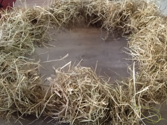 2- Découpez préalablement de petits morceaux de ficelle. Enroulez une poignée de foin autour de votre support en fixez-la avec de la ficelle. Recommencez de manière à recouvrir tout le tour du cercle avec le foin (ou les branchages).