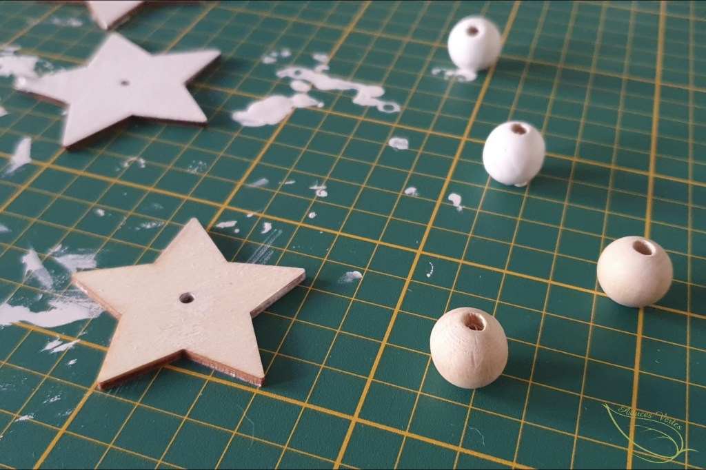 1- Peignez vos motifs en bois ainsi que vos perles. Si vous avez choisi d’utiliser de la pâte auto-durcissante, créer vos sujets à l’aide d’emporte-pièces et laissez sécher une nuit. Inutile de faire des trous au centre, vous pourrez les coller par la suite.